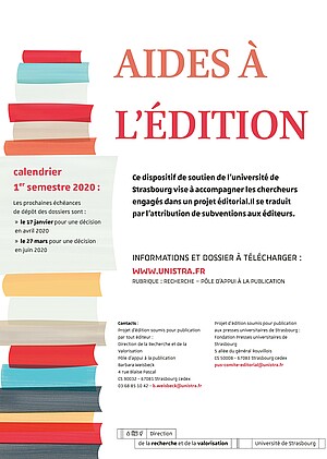 L'Université de Strasbourg propose un dispositif de soutien visant à accompagner les chercheurs engagés dans un projet éditorial. Ce soutien se traduit par l'attribution de subventions aux éditeurs pour publication d'ouvrages scientifiques : monographies, ouvrages collectifs, thèses remaniées, etc. (les publications d'articles ne sont pas éligibles). Les demandes, instruites par le Pôle d'appui à la publication, sont examinées à chaque réunion du conseil de publication.